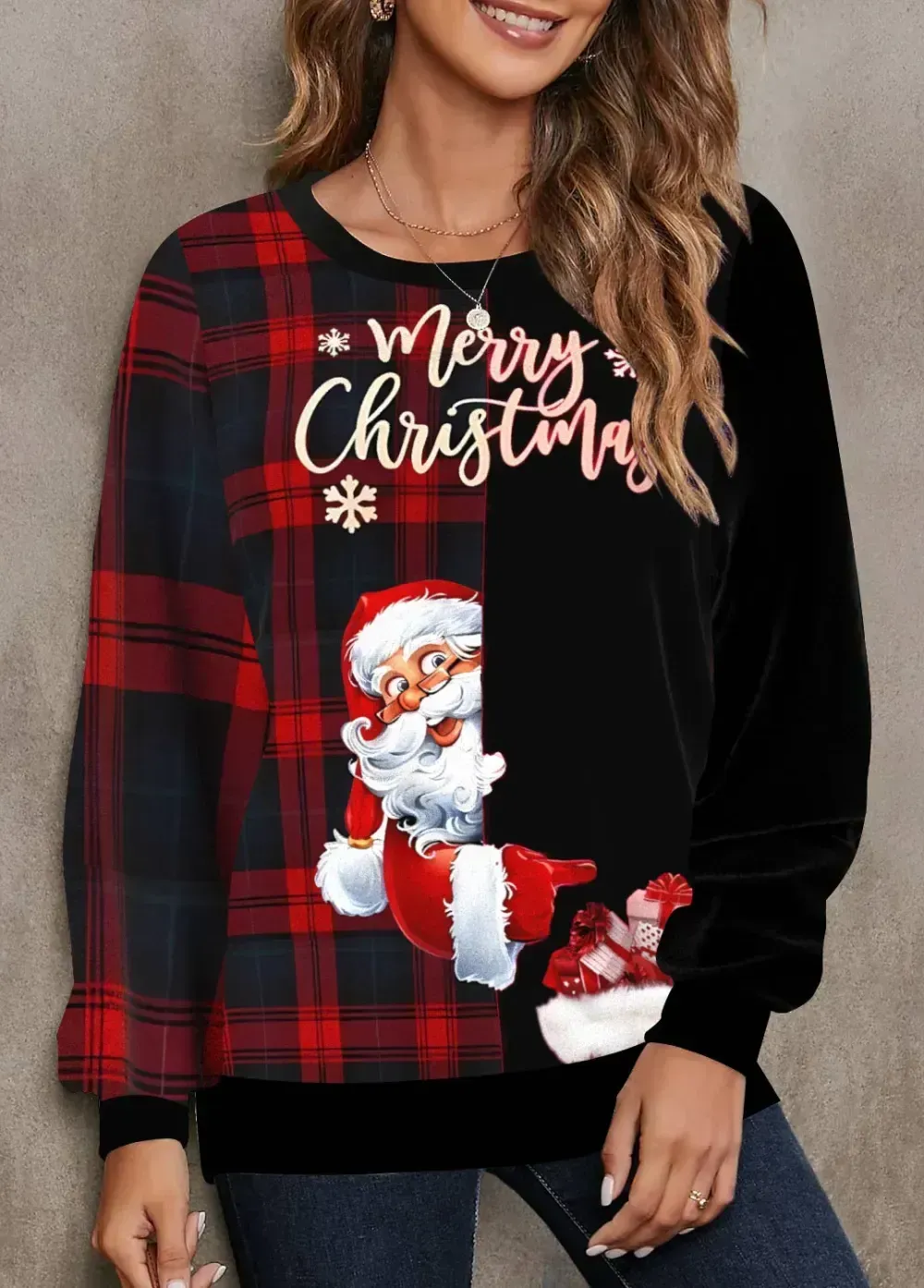 Black Patchwork Christmas Print Round Neck Sweatshirt